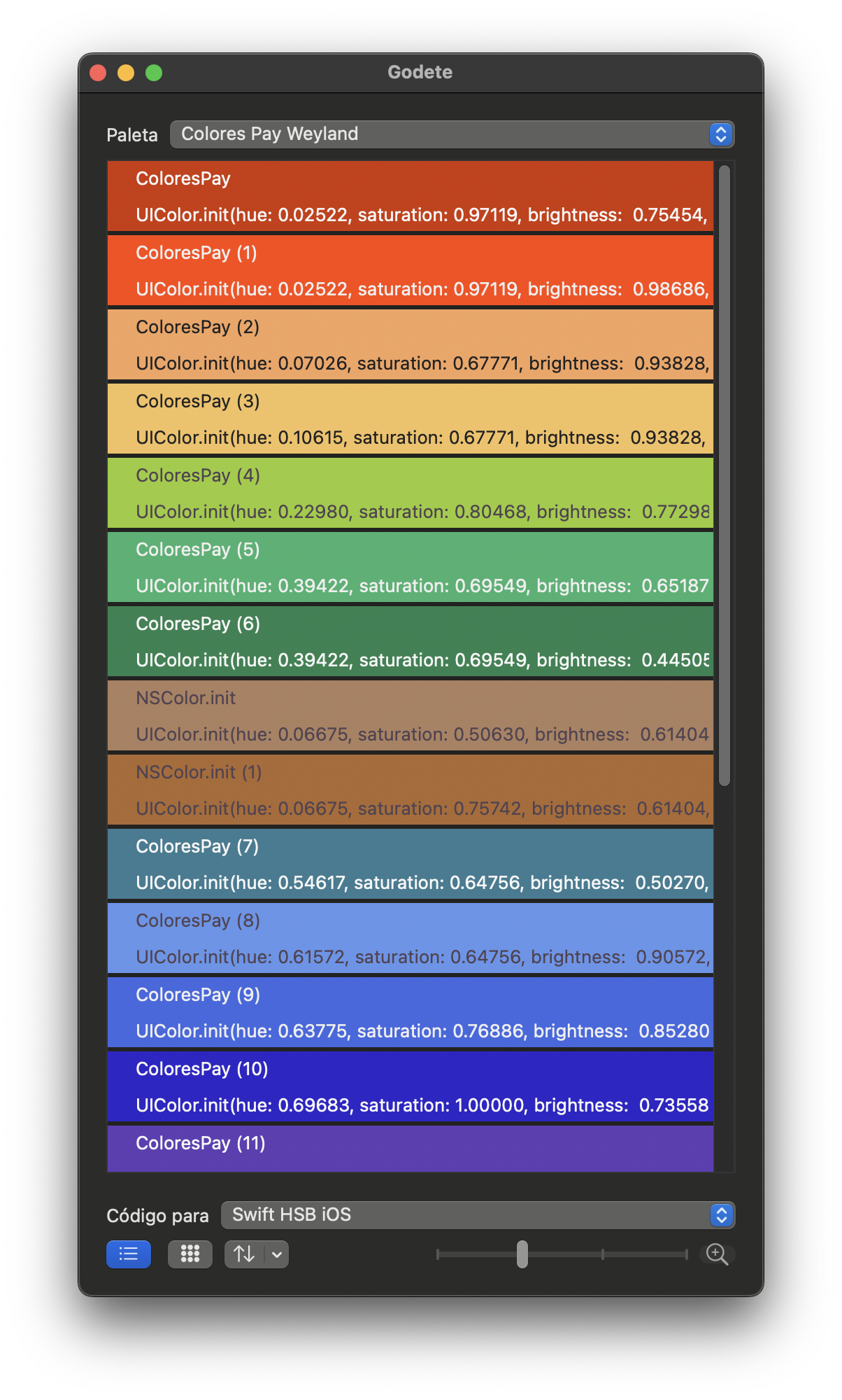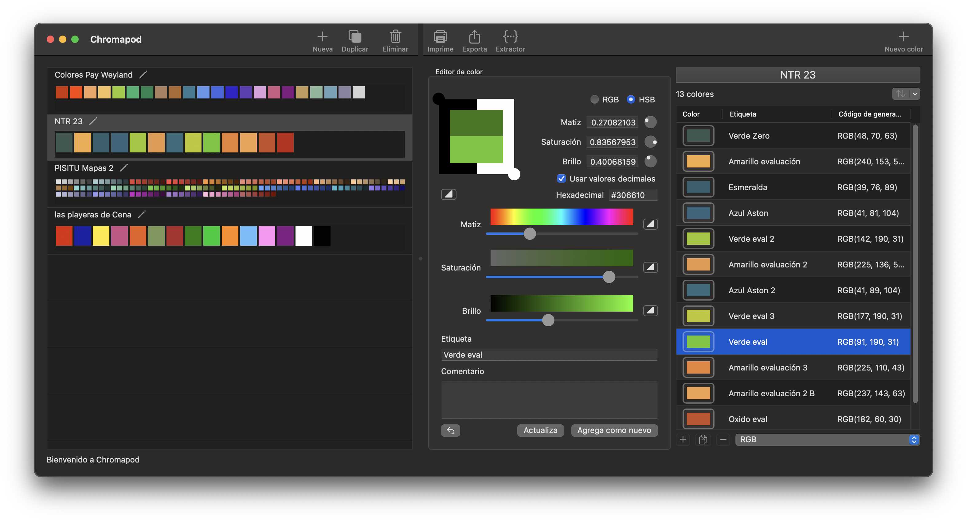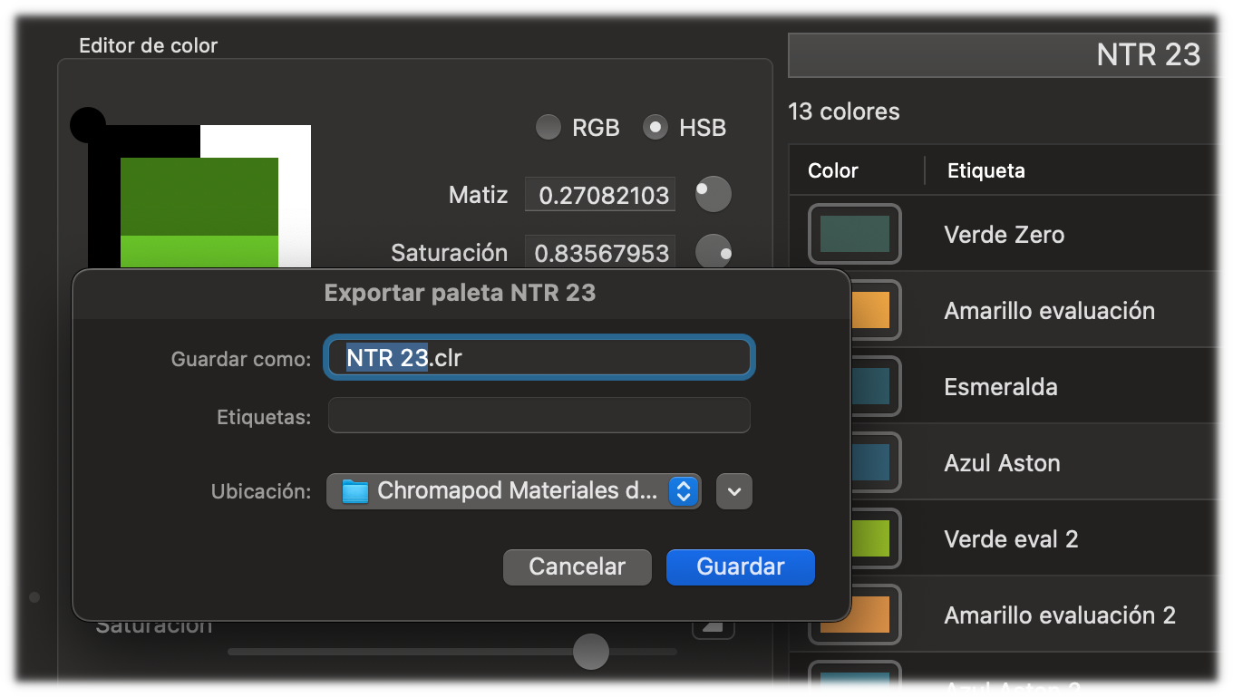 Con Chromapod también puedes tratar las paletas como un producto terminado, puedes exportarlas completas como Color List (que es el formato estándar de Apple) ya sea para incorporarlas en una aplicación que maneje color o incluirlas como parte del selector del sistema operativo, - Chromapod puede hacerlo con un solo clic - . Estos archivos Color List se vuelven un producto entregable a tus colegas o tus clientes.