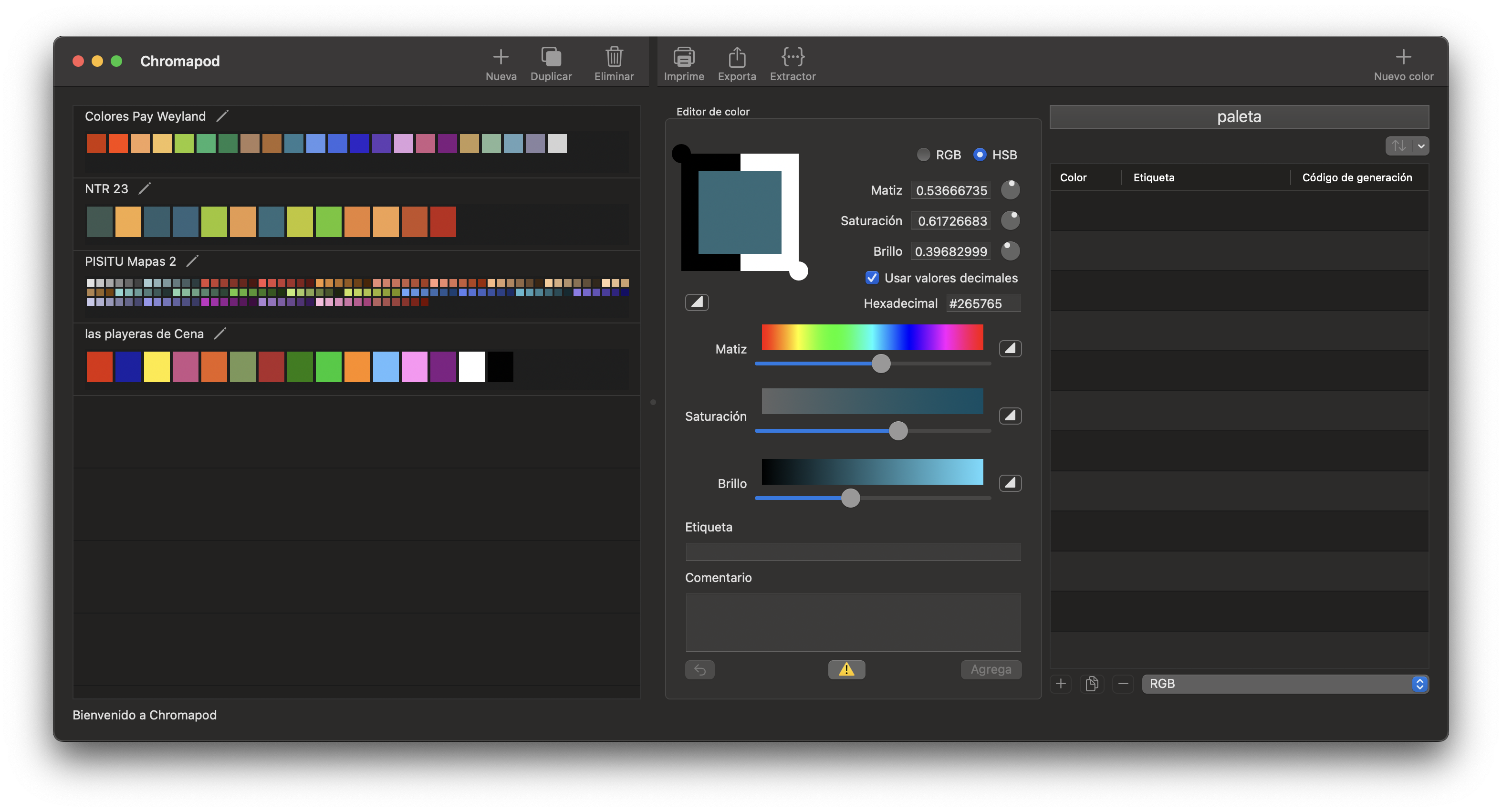 Chromapod organiza tus esquemas de color como paletas, sin limitar el número de paletas que puedas crear ni la cantidad de colores a organizar por paleta. Puedes crear nuevas paletas y colores desde cero, importarlas de otras aplicaciones o incluso rescatar automáticamente colores definidos en el código fuente de desarrollo aplicaciones y o de páginas web. En Chromapod las paletas son el elemento organizador y tu eres el maestro organizador ya que puedes reorganizar, editar, duplicar y eliminar las paletas y sus elementos como te sea necesario.