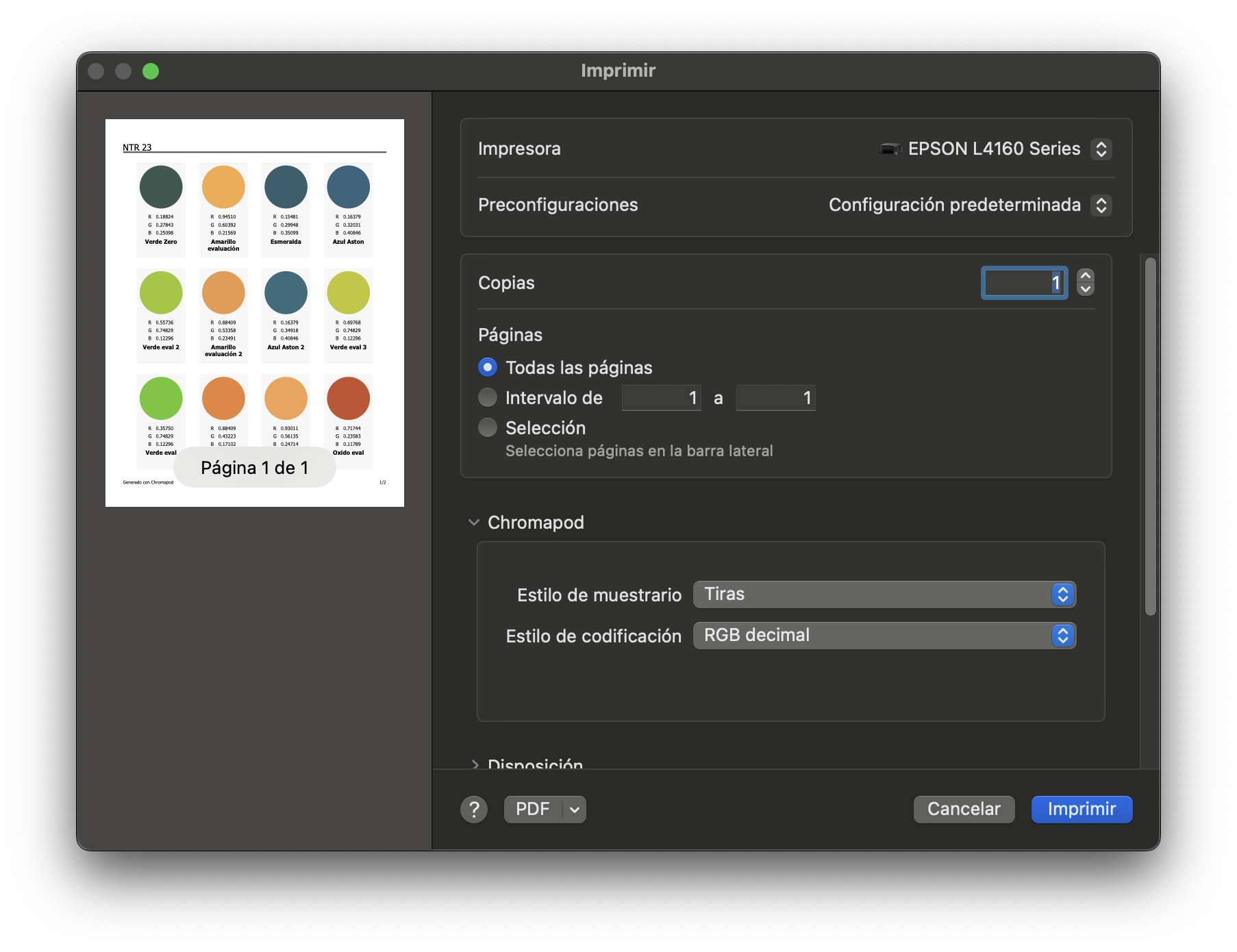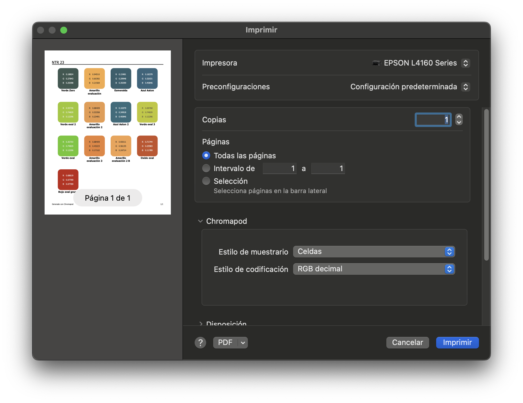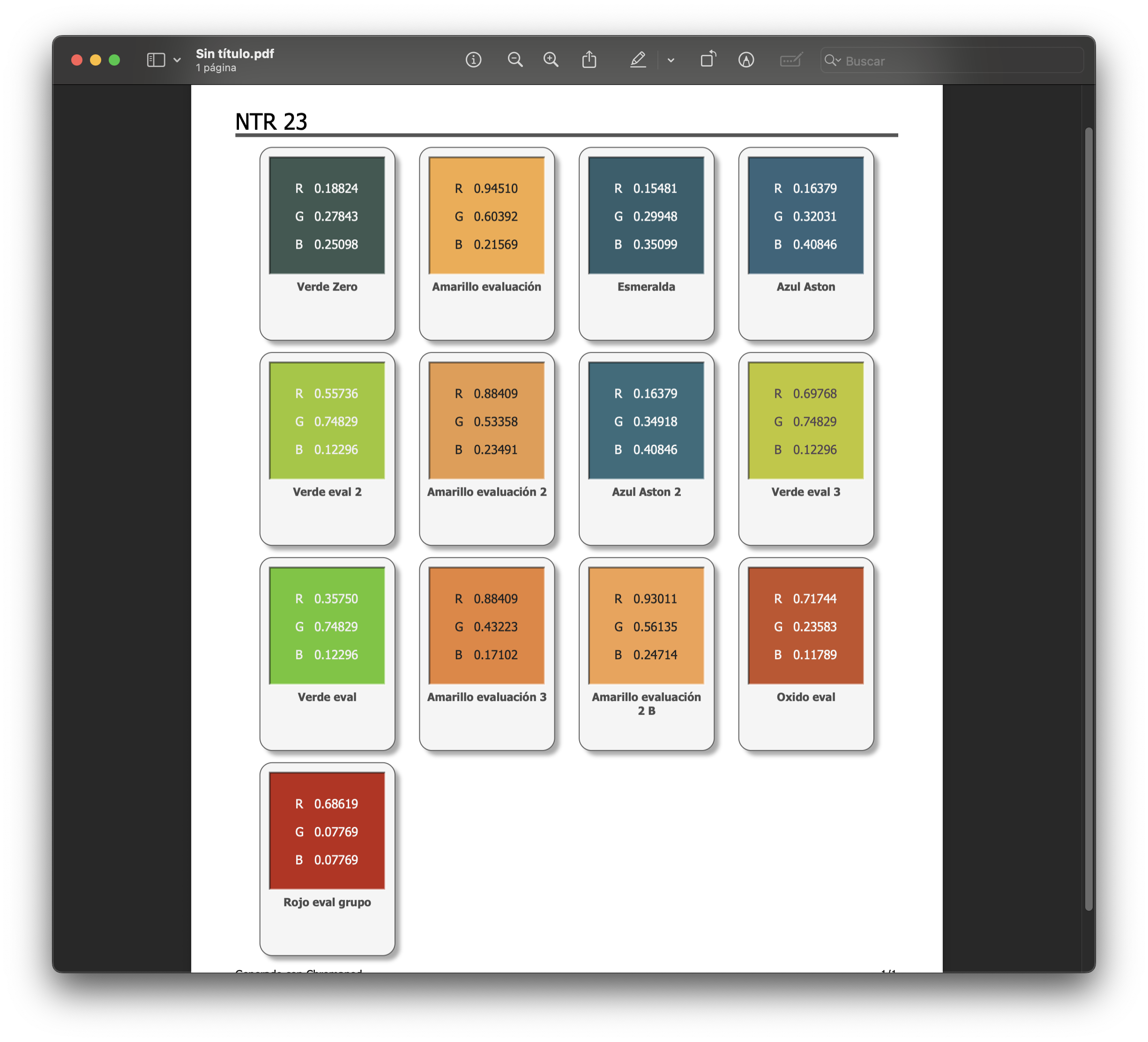 Para un método más fácilmente compartible, puede generase una muestra impresa (swatch) en alguna de las 4 modalidades de presentación para que pueda ser entregada en físico o como documento PDF. Dichos muestrarios pueden llevar las instrucciones de generación de color de cada elemento.