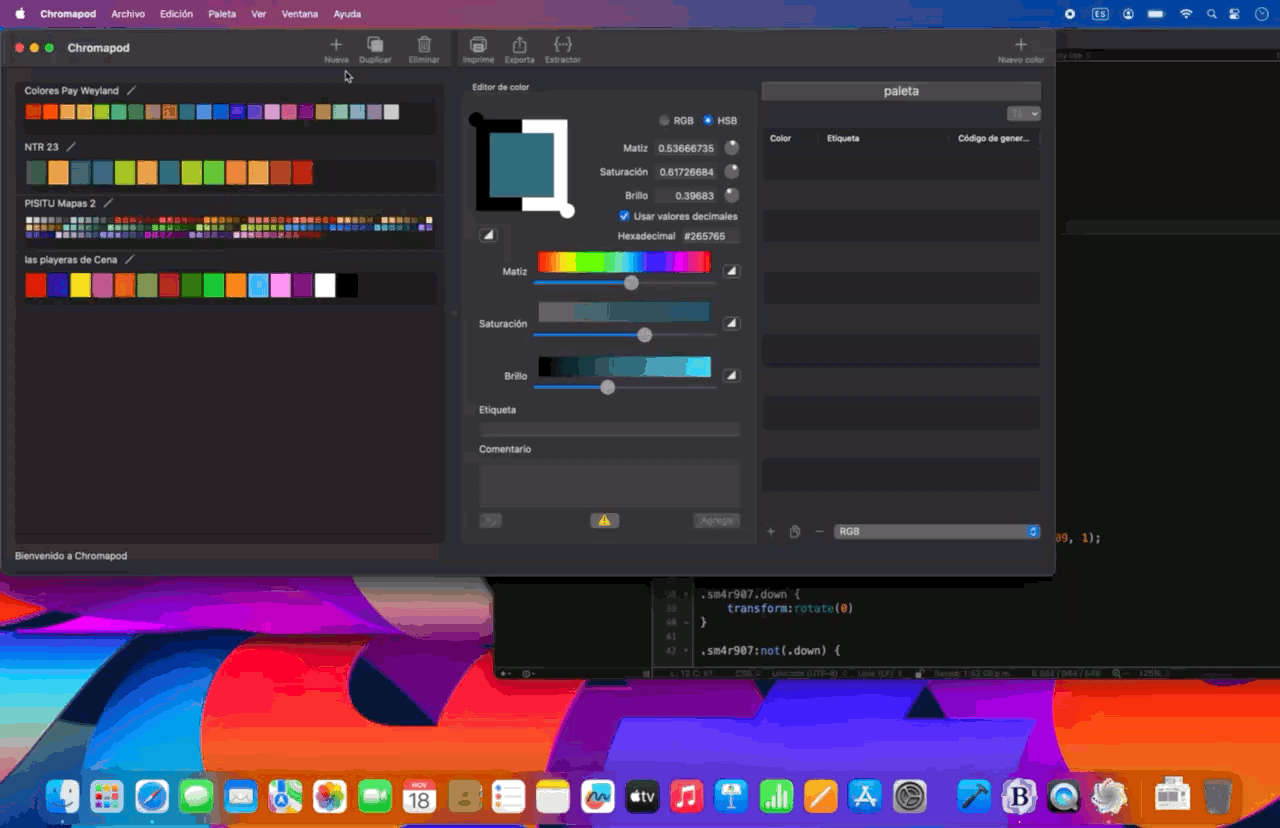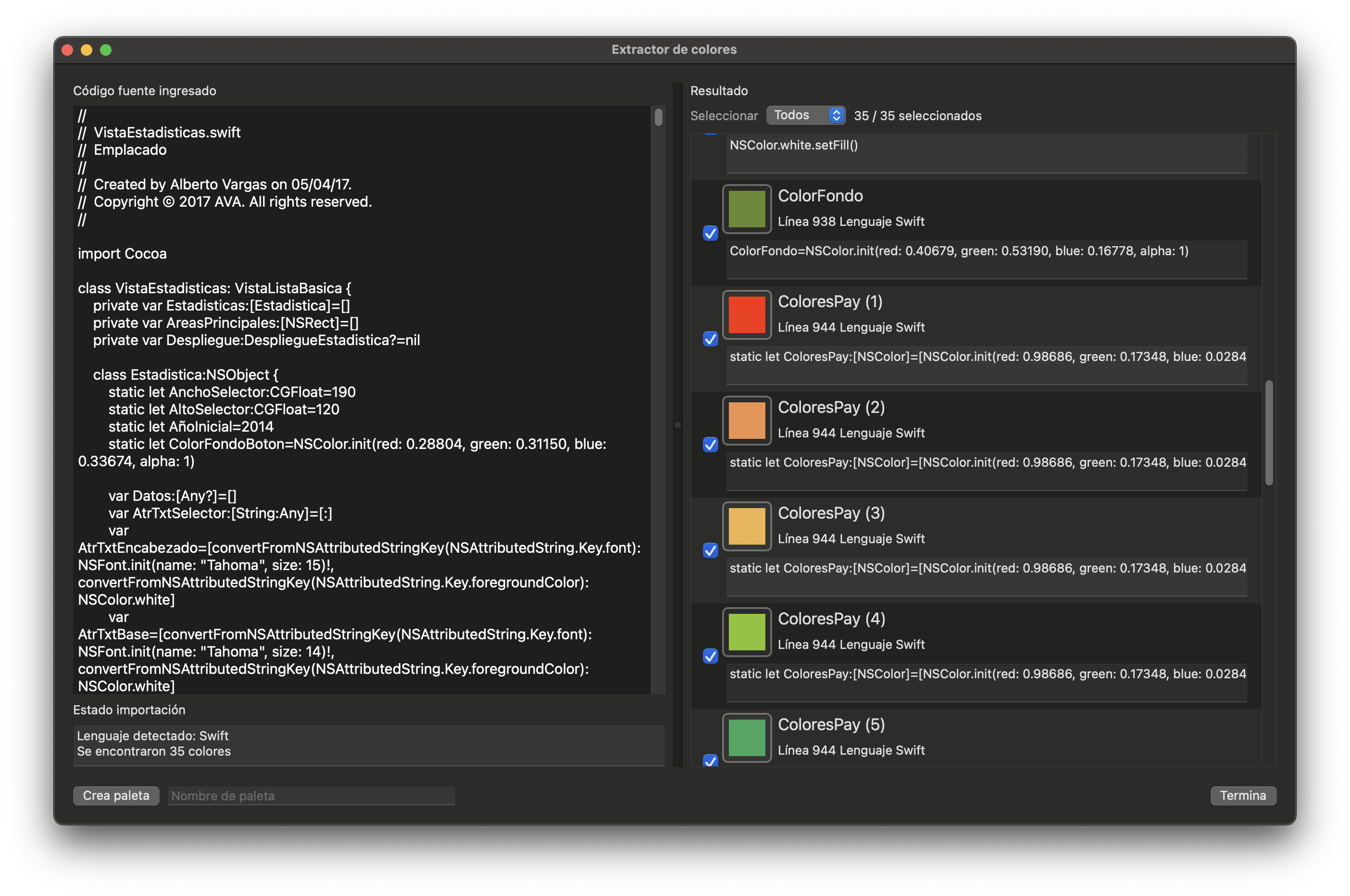 Paso 3 Elegir los colores obtenidos que serán almacenados en Chromapod, para cada color se almacenará la etiqueta obtenida desde el código fuente, generalmente el nombre de la variable o atributo que define el color, y en el comentario adicional, una copia de la línea fuente origen.