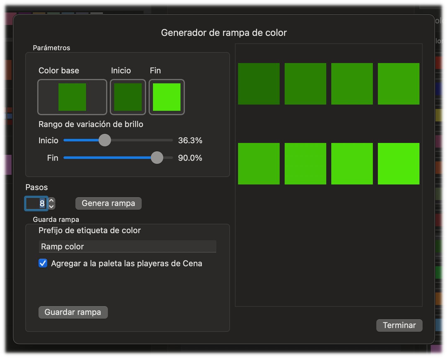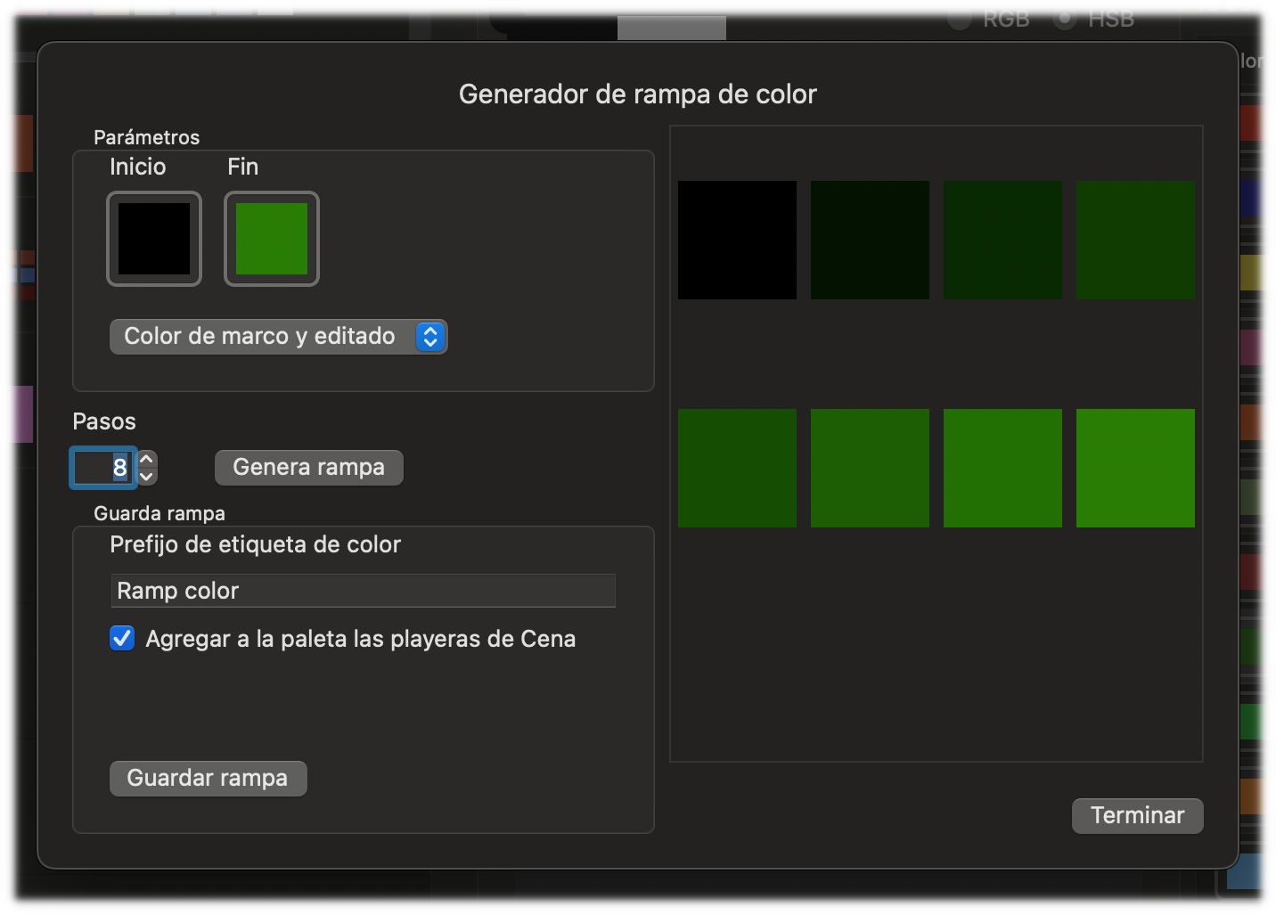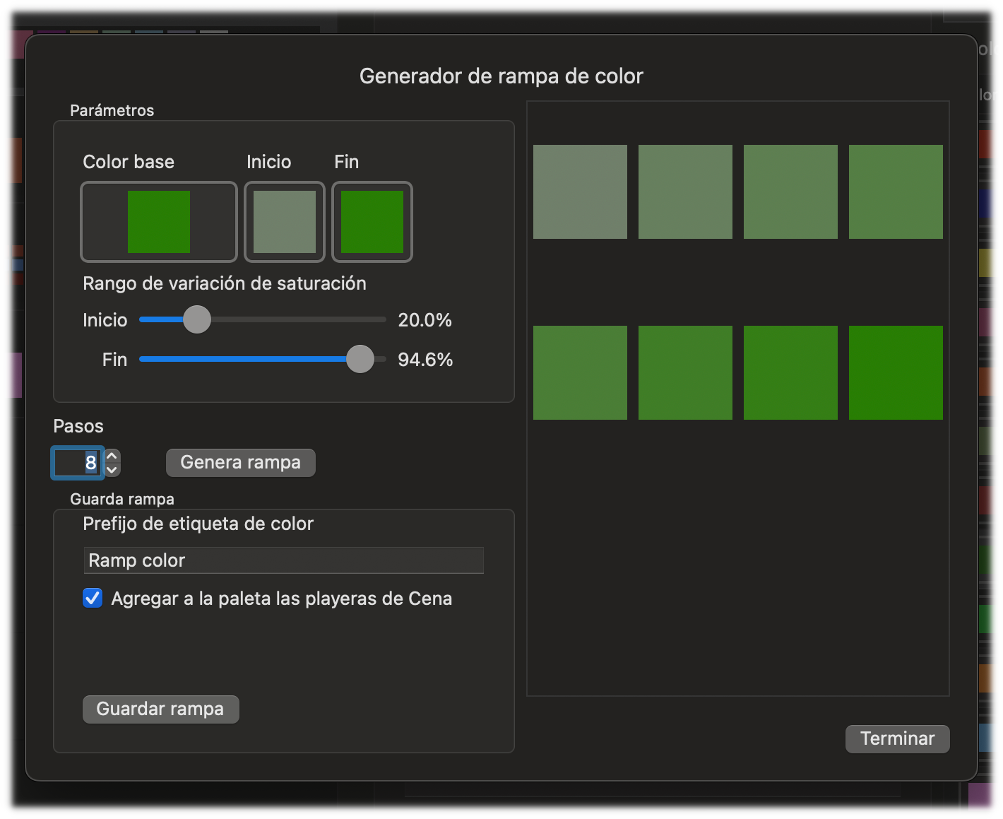 Rampa de saturación: Usando el color base se definen niveles inicial y final de saturación para computar las transformaciones.