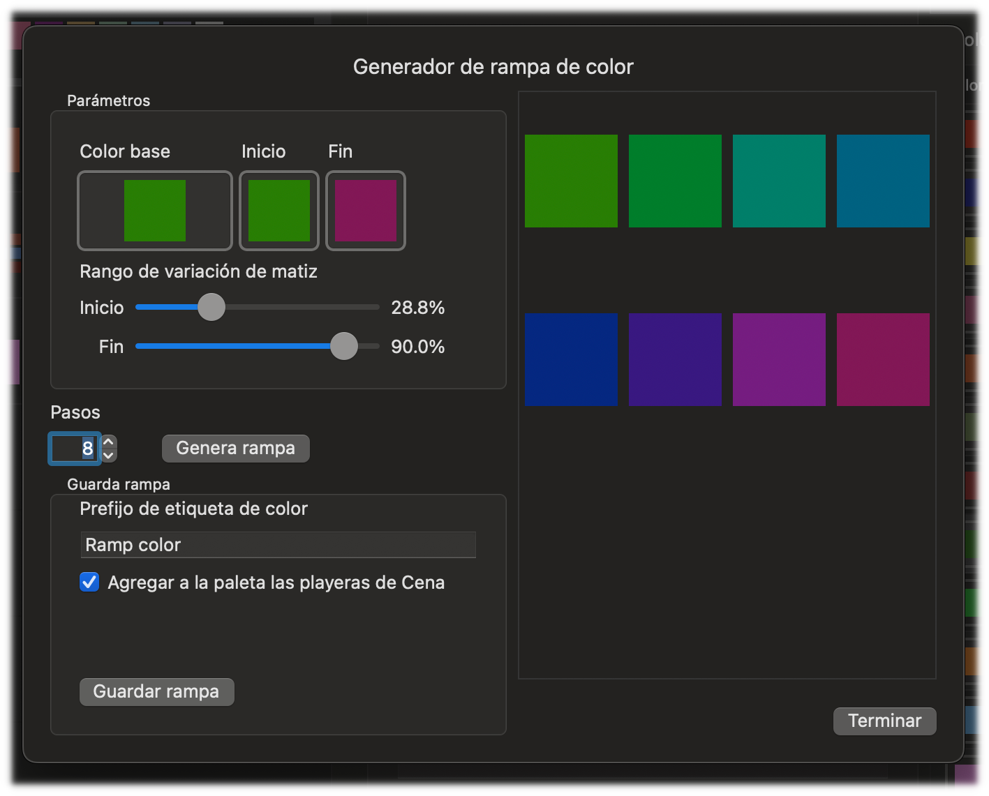 Rampa de matiz: Partiendo del color base, y definiendo un inicio y un final en el valor de matiz se computan transformaciones siguiendo los parámetros.